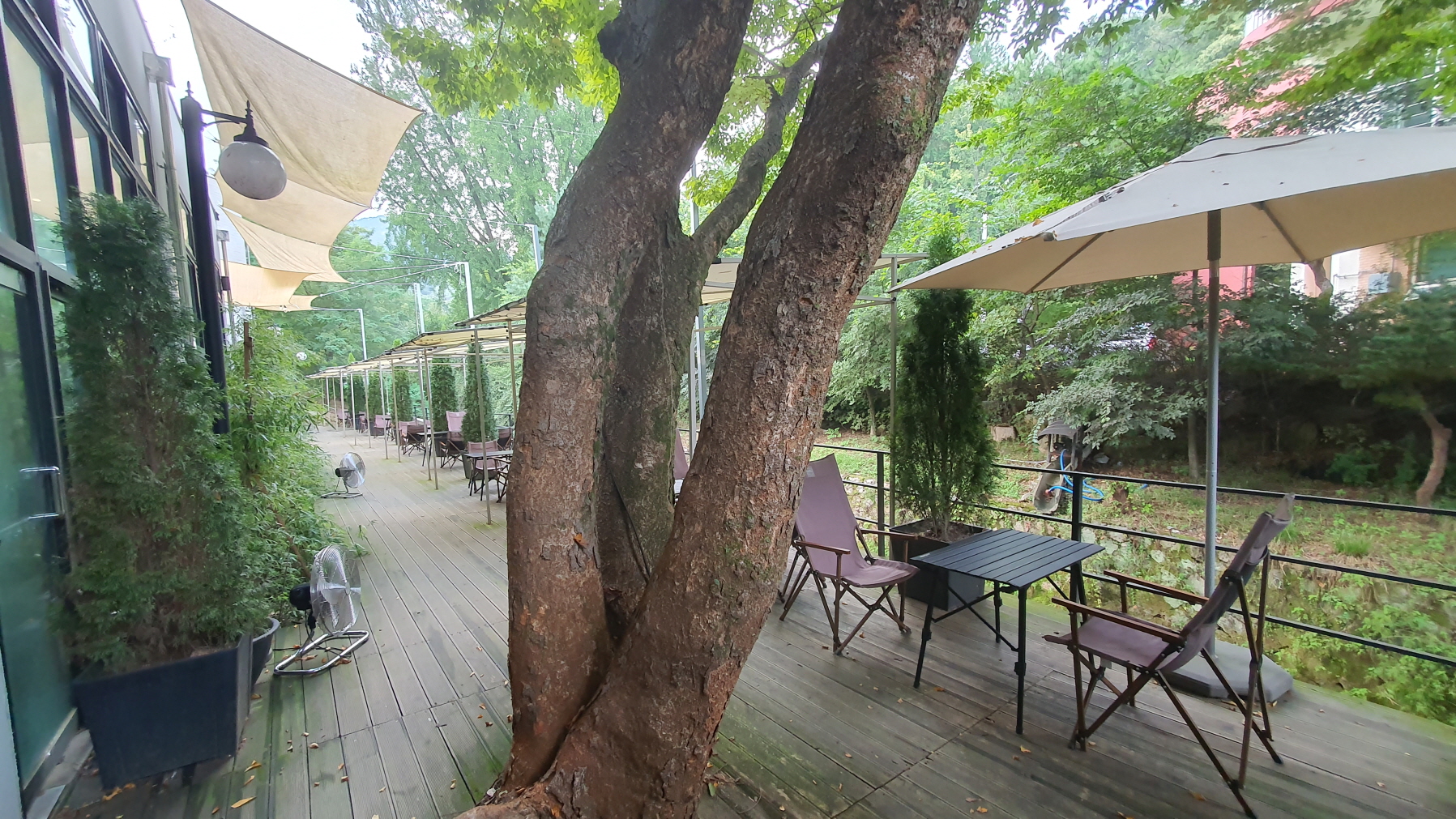 창을 따라 테이블들이 있어요. 창 옆으로는 야외 테이블과 그 옆에 계곡입니다.