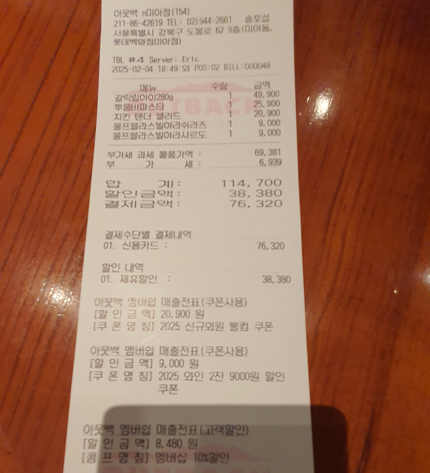 할인 방법은 아웃백 앱 가입해서 다양한 할인 쿠폰 꼭 활용하시고요.