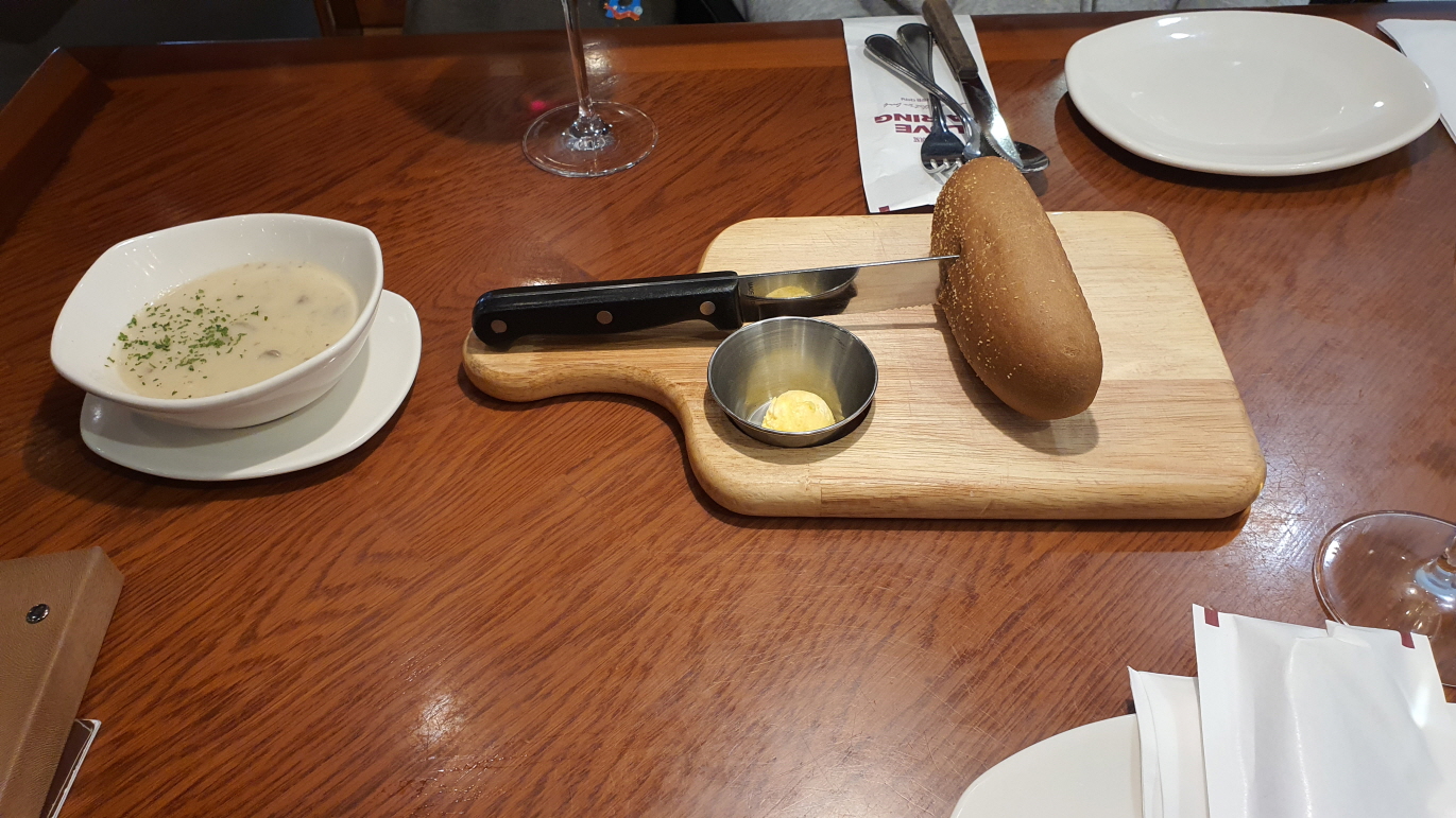 배가 엄청 고팠는데, 둘이서 브레드, 양송이 스프에 찍어서 너무 맛있게 슥삭했습니다.