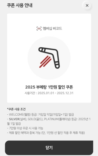 2. 2025 부메랑 1만원 할인 쿠폰(가입 후 다음날 받음)