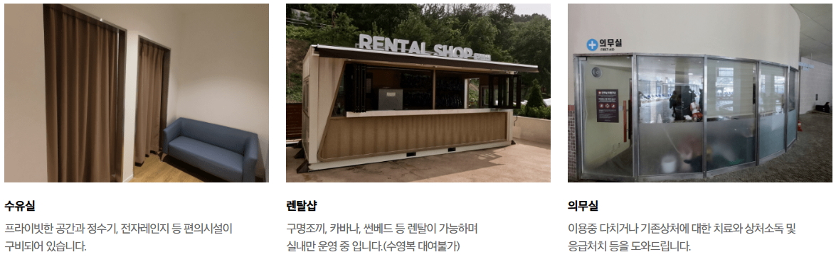 카페테리아, 푸드코트, 수영복 매장, 수유실, 렌탈 샵 등을 운영합니다.