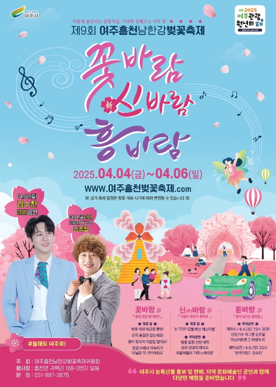 경기도 여주시 흥천면 귀백리 일원에서 열리는 이 축제는 약 1.7km의 벚꽃길이 특징입니다. 축제 기간 동안 차량을 통제하여 방문객들이 안전하게 벚꽃을 감상할 수 있도록 하며, 야간에는 별빛 포토존과 특설무대 공연이 진행되어 환상적인 분위기를 제공합니다. 또한, 다양한 체험 프로그램과 지역 농특산물 및 먹거리 부스가 운영됩니다.