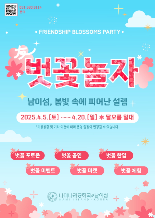 남이섬에서 열리는 '벗(友)꽃놀자' 축제는 2025년 4월 5일부터 4월 20일까지 개최될 예정입니다. 이 기간 동안 다양한 이벤트와 공연이 준비되어 있어 벚꽃 감상과 함께 특별한 추억을 만들 수 있습니다. 특히, 남이섬은 벚꽃과 함께 다양한 봄꽃이 어우러져 아름다운 경관을 자랑하며, 사진 촬영을 위한 포토존도 마련되어 있습니다