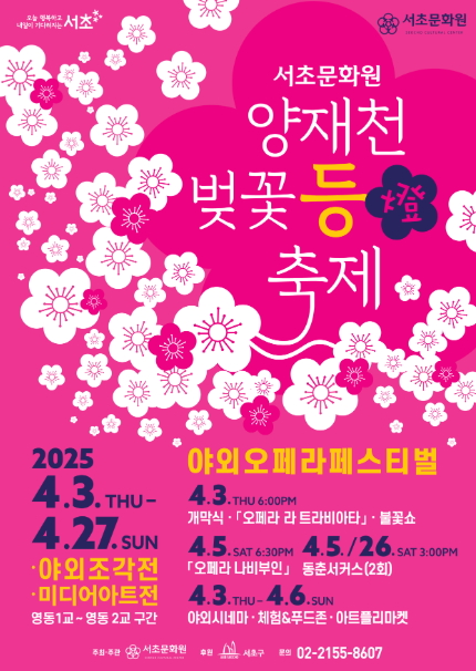 양재천 벚꽃등 축제는 서울 서초구 양재천 일대에서 열리는 행사로, 벚꽃과 함께 다양한 등(燈) 장식이 어우러져 아름다운 야경을 선사합니다. 축제 기간 동안 음악 공연, 아트 플리마켓, 체험 프로그램, 푸드트럭, 거리공연 등 다양한 볼거리와 즐길 거리가 마련되어 있습니다.