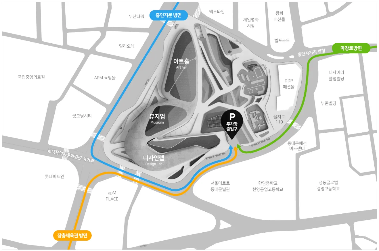 입구: DDP 주차장은 한 곳(디자인플라자 내부 진입로)에 위치하며, 비교적 넓은 진출입로로 초보 운전자도 이용하기 쉽습니다.