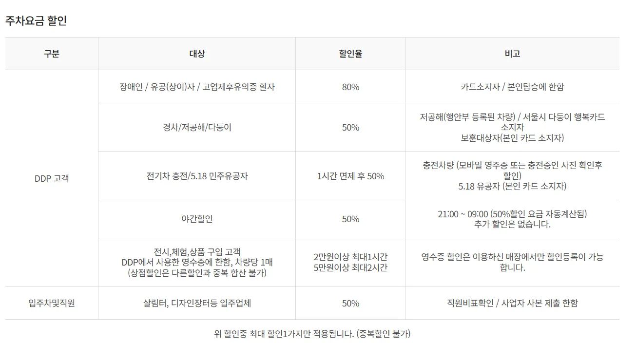 더 궁금한 사항이 있다면 DDP 공식 홈페이지나 주차장 운영 관리센터에 문의하는 것도 도움이 됩니다.