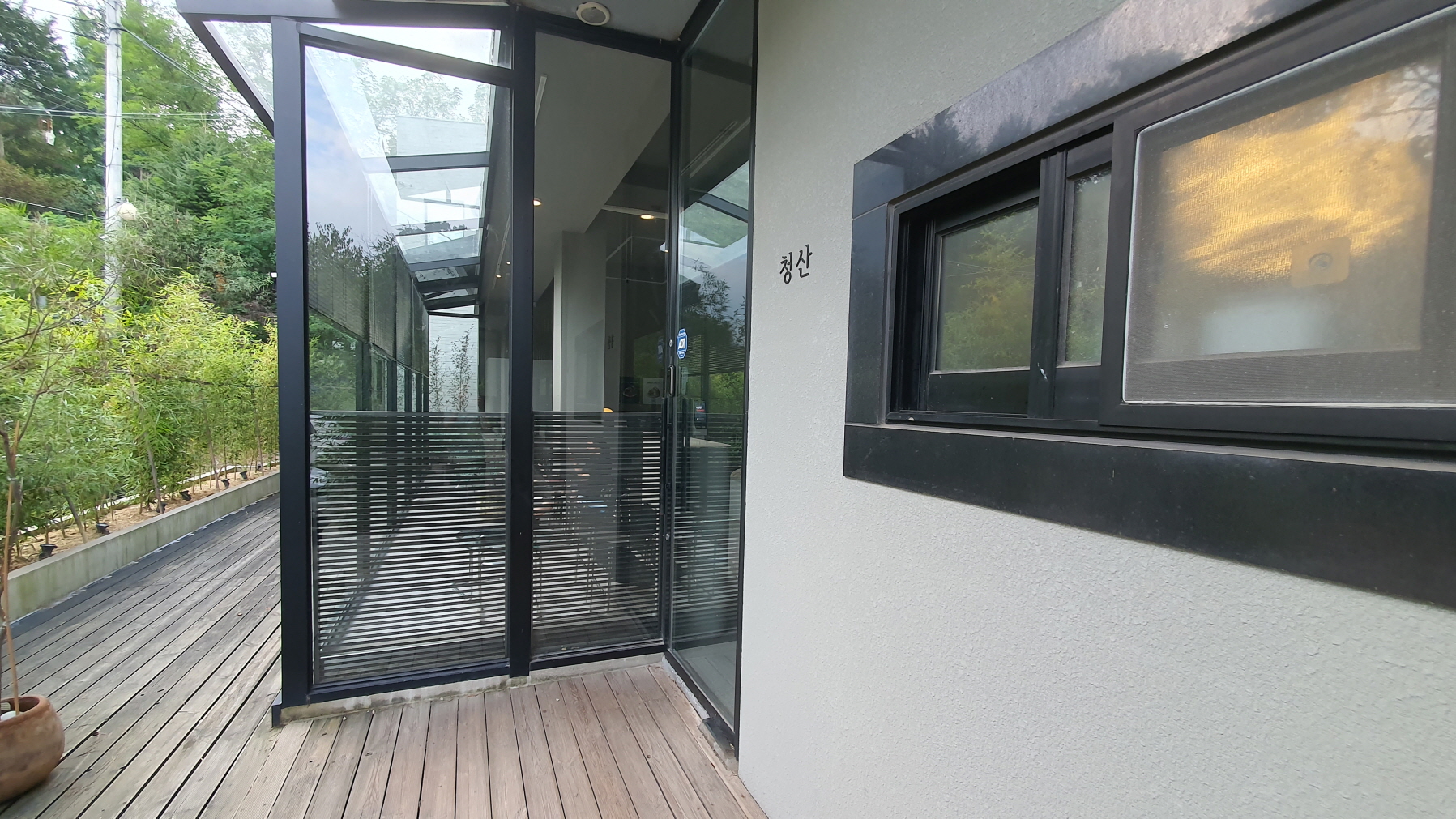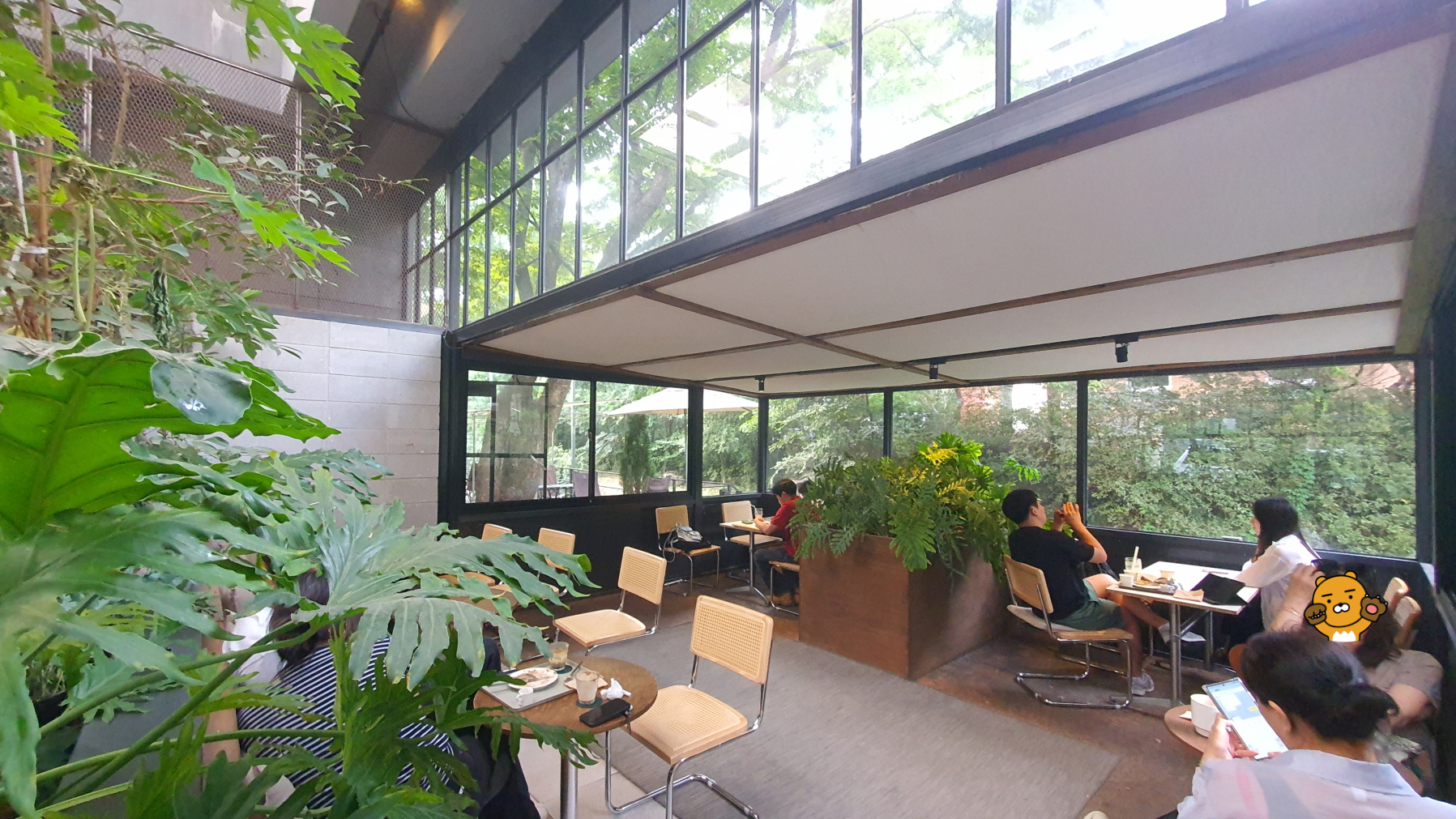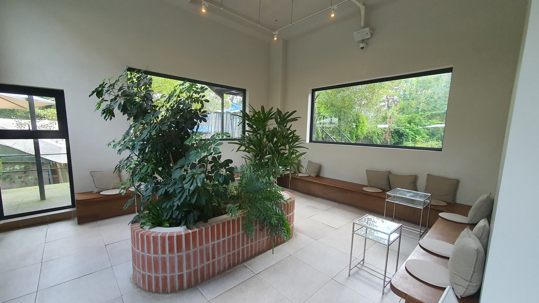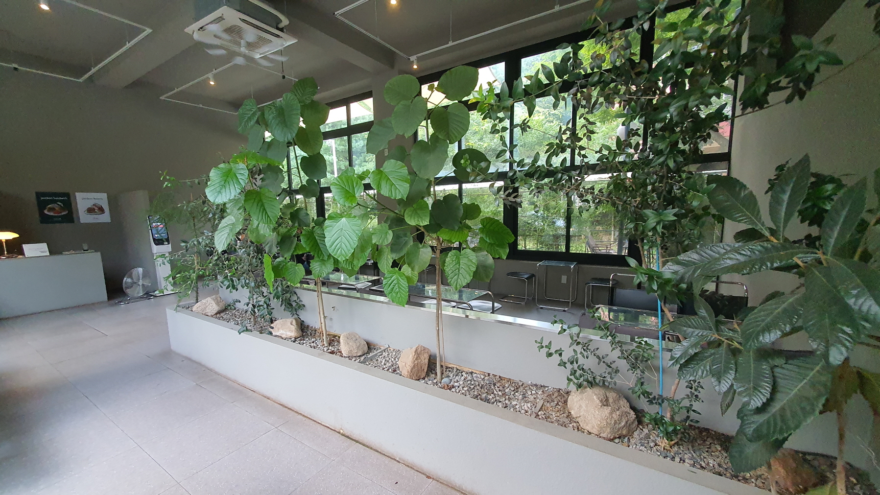 카페 산아래의 시그니처 공간이 유리온실 밖으로 푸릇한 자연이 있는 공간이 보입니다.