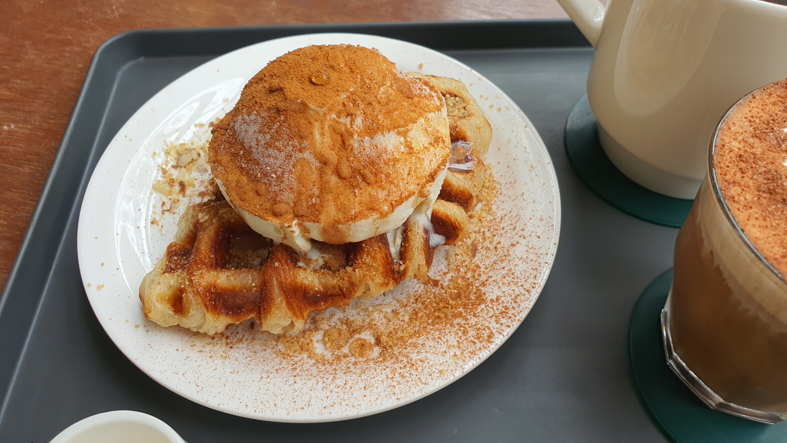 따뜻한 크러플 위에 시나몬 가루, 그 위에 아이스크림도 크게 한스쿱이라 아주 잘 먹었습니다.