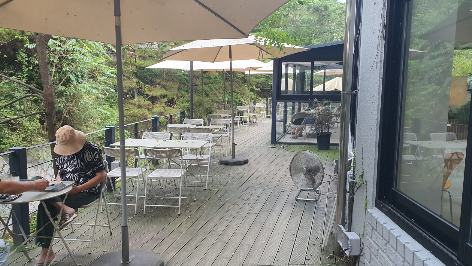 창을 따라 테이블들이 있어요. 창 옆으로는 야외 테이블과 그 옆에 계곡입니다.