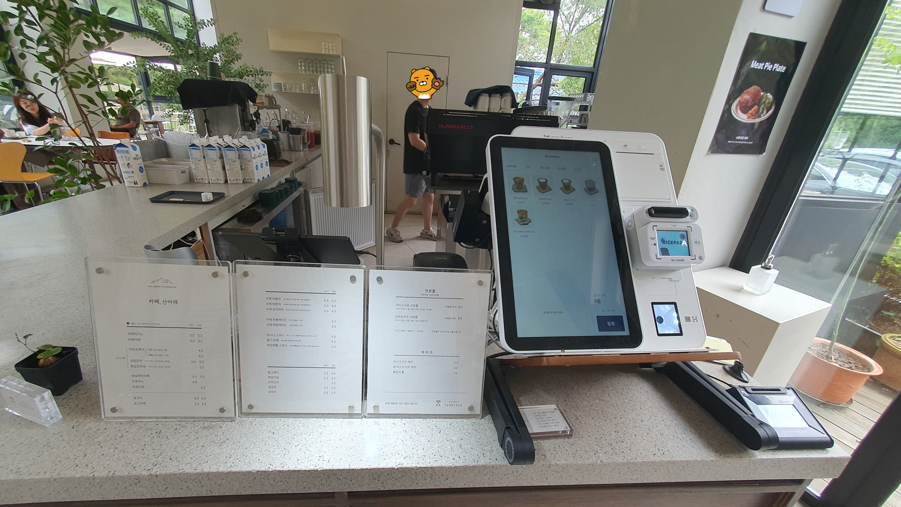 메뉴판이 있고, 키오스크로 직접 사진을 보며 주문할 수 있어요. 계산도 직접 합니다.