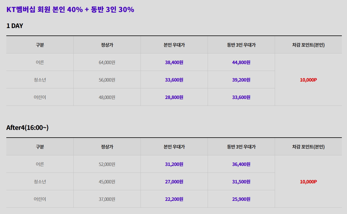 KT멤버십 회원 본인 40% + 동반 3인 30% 할인