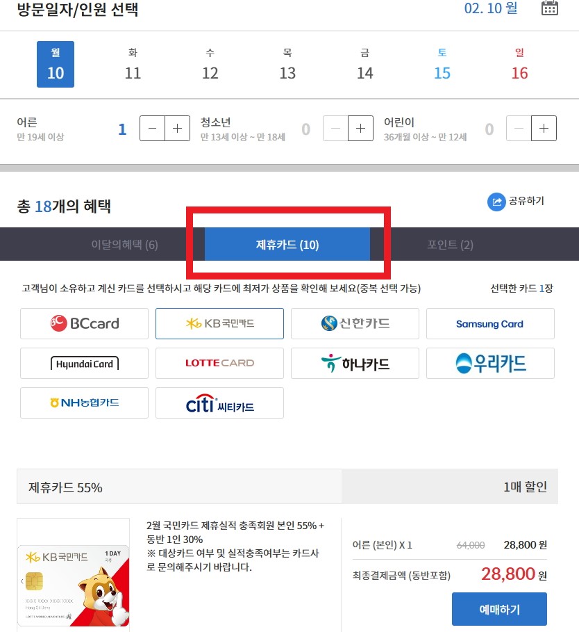 롯데월드 공식 홈페이지에서 제휴카드로 구매시 55% 할인 받을 수 있습니다.