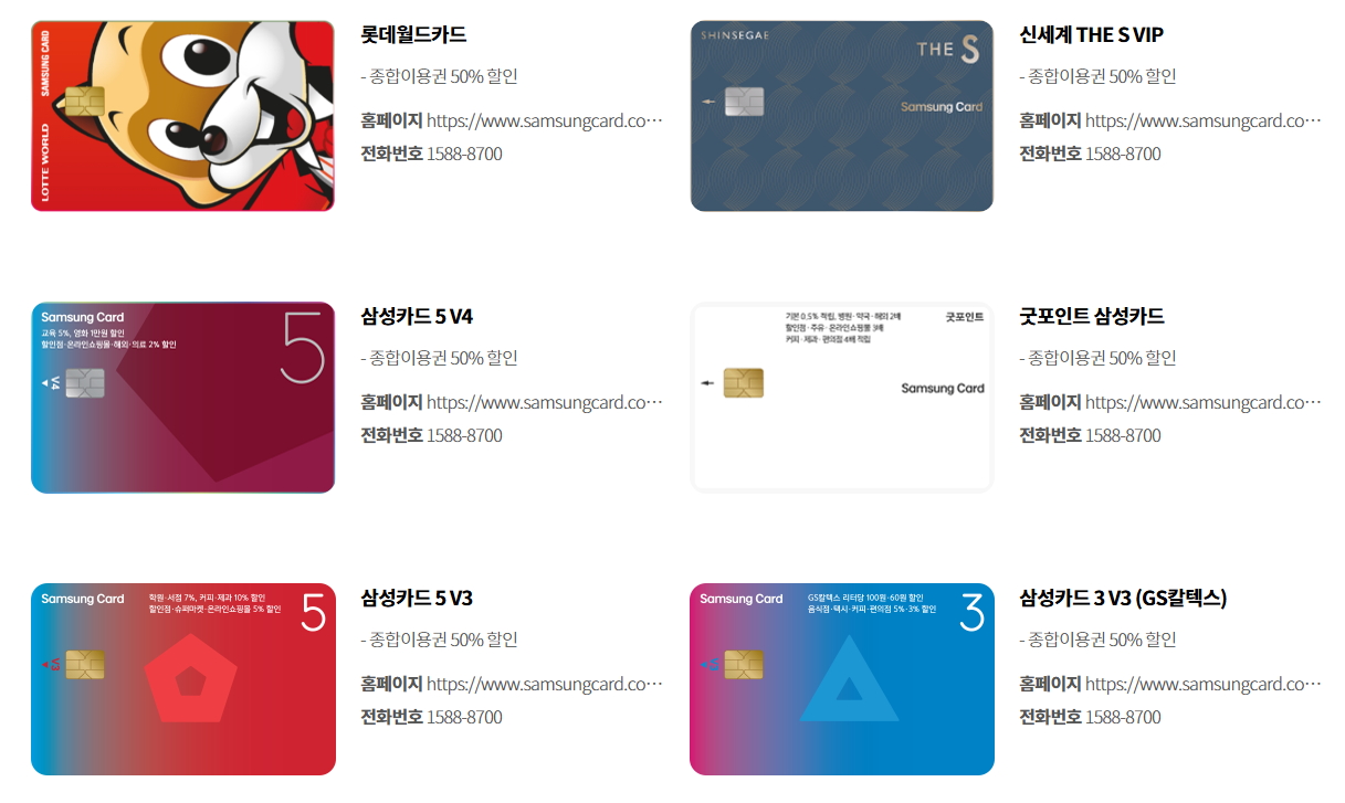 => 등 78개 삼성카드 자유이용권 50% 할인 적용