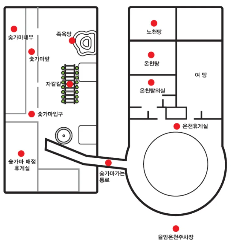 율암온천에서는 대형 온천탕, 노천탕, 참숯가마 찜질방 등을 이용할 수 있습니다.